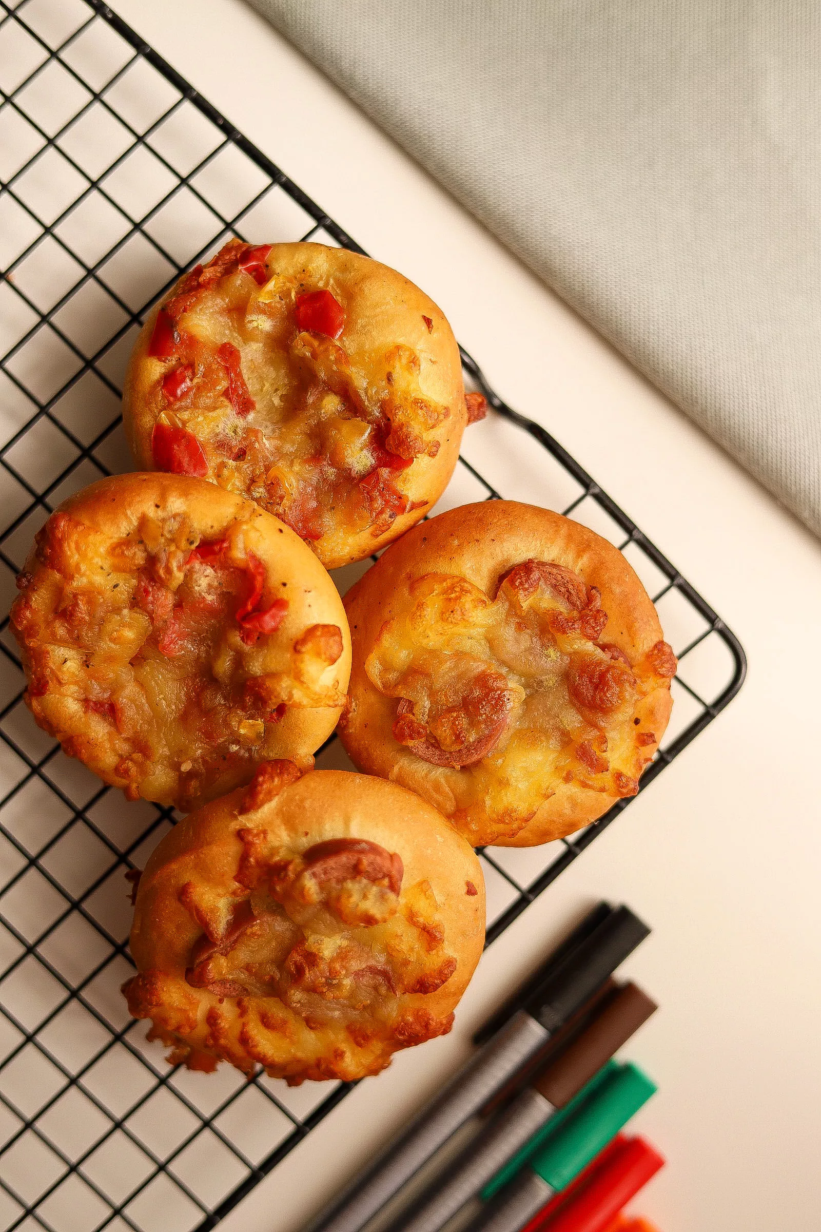 Bite-sized, cheesy pizza of two flavors, veggies and hotdog
