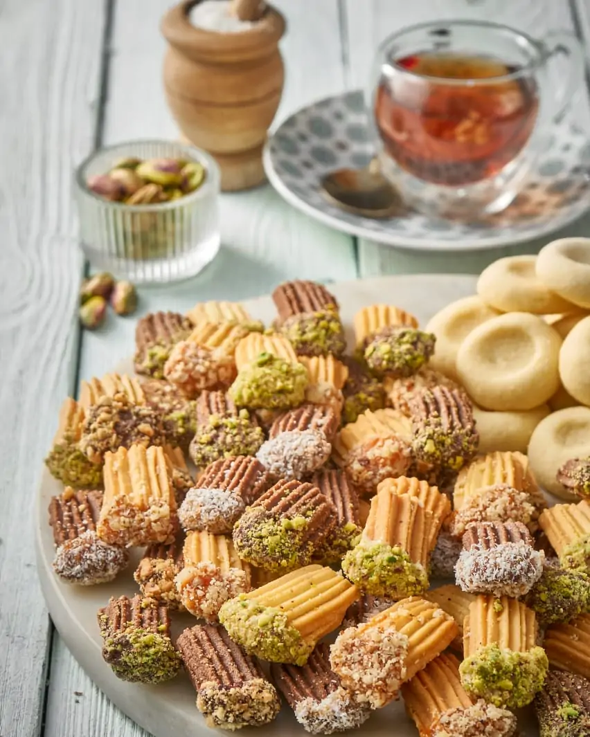 Delicate petit four vanilla and chocolate biscuits, filled with chocolates and jams then garnished with nuts and coconut