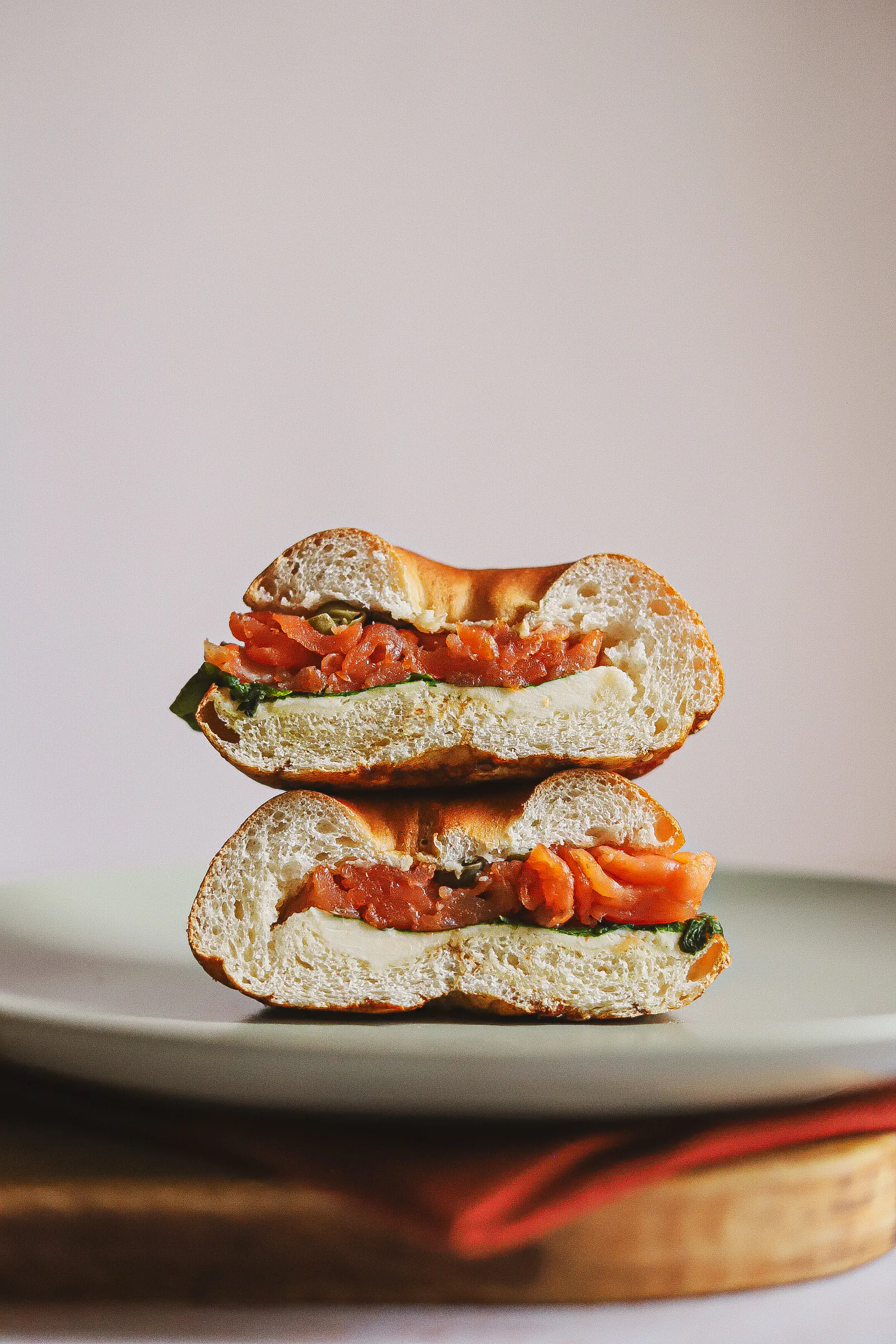 Smoked salmon, cream cheese, arugula and capers in a bagel bun